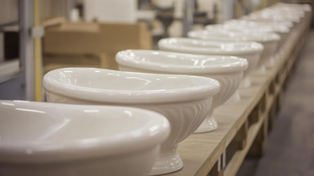 A row of ceramic toilets and sinks lined up in a factory production area.