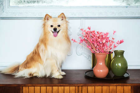 Portrait of a Spits dog in decorated interior studio