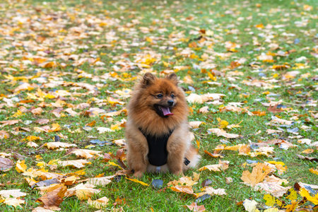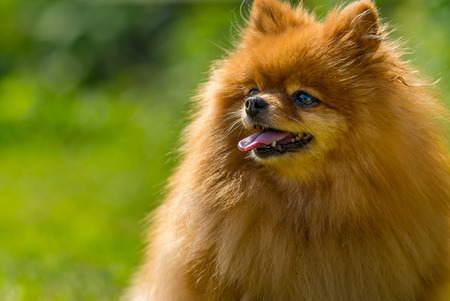 Adorable Pomeranian dog in orange colors sitting outdoors