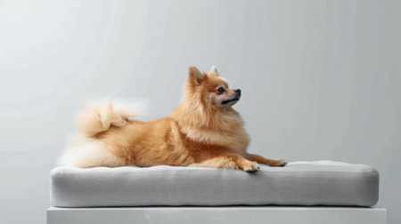 With a proud stance and a magnificent plumed tail, this elegant Pomeranian poses for a studio portrait. Its luxurious orange coat and confident expression capture the charm and beauty of a well-loved and pampered companion, embodying pure poise and canine grace.
