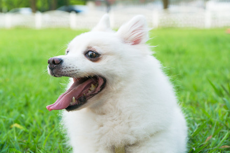 Dog pomeranian spitz stick tongue out at park.