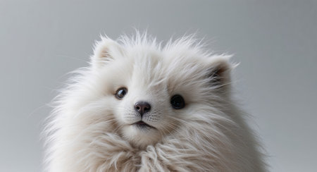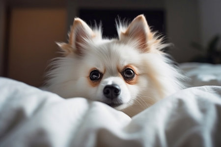 Pomeranian on a white sheet close-up, created with Generative AI technology.