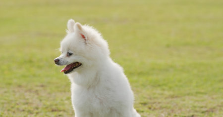 Image of pomeranian spitz in the garden. Cute white little dog outdoor.