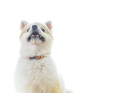 Cute young pomeranian dog. Beautiful puppy spitz sitting isolated on white background, studio shot. Ridiculous miniature dog.