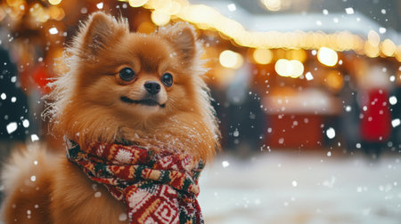 Cute Pomeranian dog wearing a scarf in a snowy outdoor setting during winter festivities