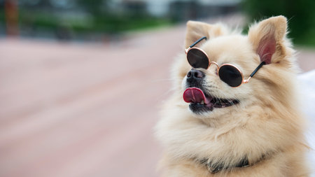 funny and joyful pomeranian spitz sticking out tongue and looking at camera in dog hotel, banner