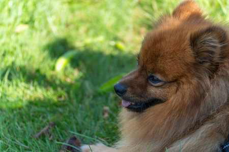 Pomeranian dog resting. A fluffy Pomeranian dog lies on green grass, looking calm. Its brown fur shines in natural light.