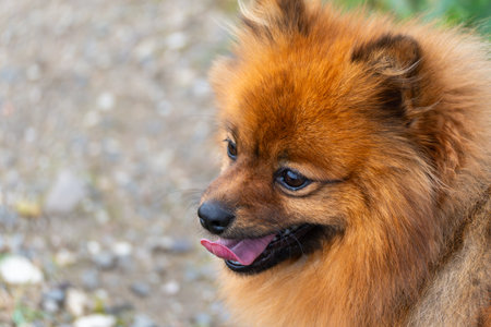 Pomeranian Dog Portrait. A fluffy Pomeranian dog with reddish-brown fur looks to the side with its tongue out. Captured in natural light outdoors.