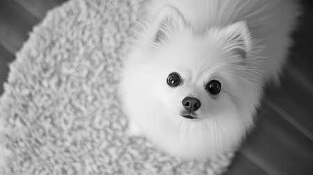 This charming image features an adorable white dog looking up from a cozy rug, capturing a moment of innocence and playfulness in a domestic setting.