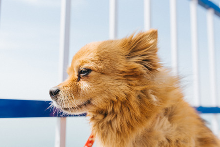 Pomeranian Dog. Close-up of a cheerful pet against the sky.