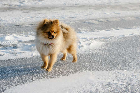 Cute puppy Pomeranian breed dog walking outside among the snow in a winter landscape.