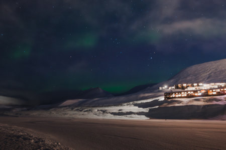 Snowy arctic landscape in Longyearbyen, Svalbard in the winter polar night