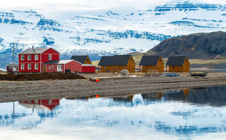 Beautiful scenery and reflection of the small cottage in Mjoeyri resort nearly Eskifjordur town of east fjord of Iceland.