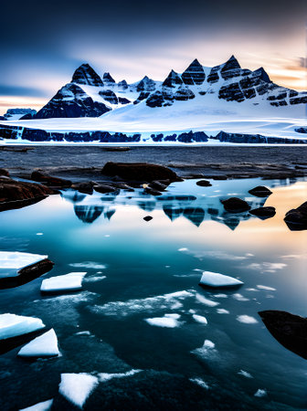 Snow-covered peaks tower above still waters at dusk, their reflections creating a breathtaking showcase of twilight colors in a remote Arctic landscape.