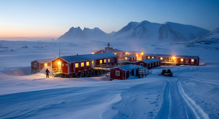 An atmospheric shot of a remote research station in a vast, snow-covered polar landscape at dusk. The warm lights from the cluster of red buildings create a welcoming glow against the cold, blue twilight and distant icy mountains. The image conveys themes of scientific exploration, isolation, and human resilience in extreme environments.
