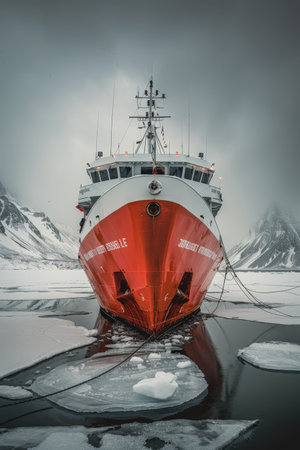 An icebreaker ship carves a determined path through the frozen expanse of the Arctic Ocean.