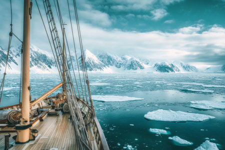 View from deck of wooden sailboat on frozen sea with ice floes and snowy mountains in background. Concept of adventure and world exploration