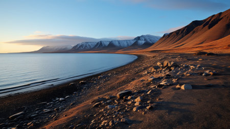 a photo of a sea on the other side of the ocean, showcasing the terrain reminiscent of northern china with its dark beige and orange hues. captured using a tokina at-x 11-16mm f/2.8 pro dx ii lens, the image highlights the natural beauty of norwegian nature, characterized by light blue waters and dark amber tones. the composition showcases rural landscapes with intense shadows. ai generated