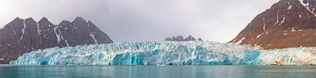 Panorama of glacier above the sea with the mountains behind, Svalbard, Norway