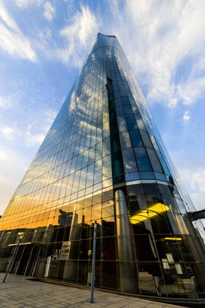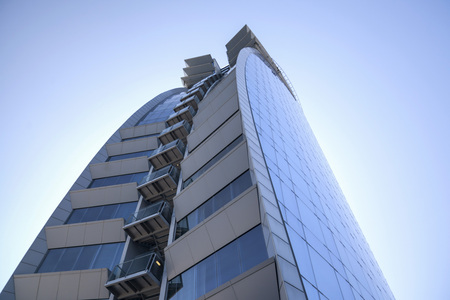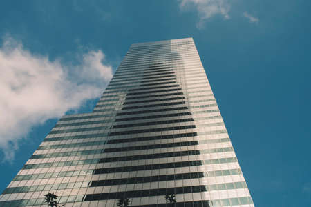 underside panoramic and perspective view to steel blue glass high rise building skyscrapers, business concept of successful industrial architecture