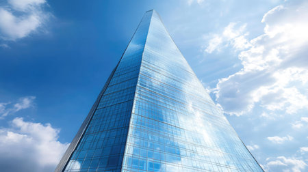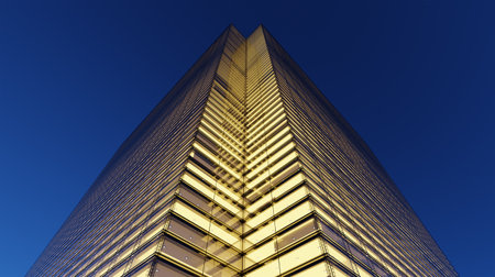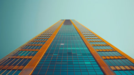 This image captures a modern skyscraper towering into a clear blue sky, highlighting contemporary architectural design and a striking glass fa