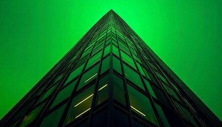 A low-angle view captures the imposing facade of a modern glass skyscraper reaching into a surreal, vibrant green sky. The image evokes a sense of futuristic ambition, corporate power, and technological innovation, perfect for themes of finance, data security, or sustainable growth.