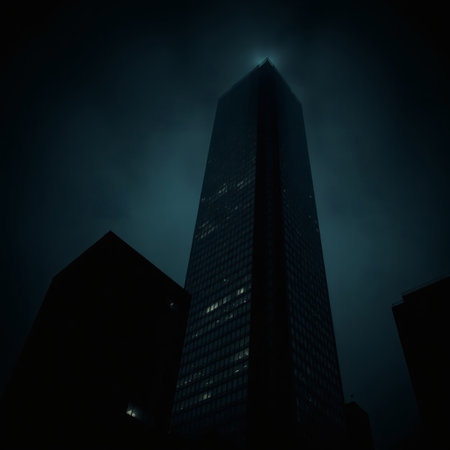 Low-angle shot of dark high rise office building.