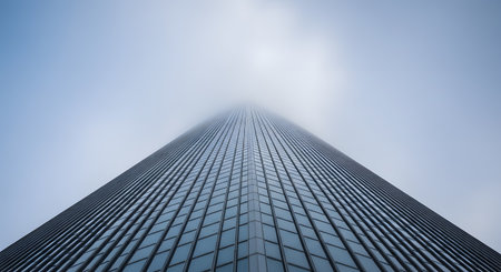 A low-angle, symmetrical shot looking up the corner of a towering glass skyscraper as it disappears into a dense layer of fog or clouds. The building's facade creates a vanishing point perspective against the pale blue and white sky.