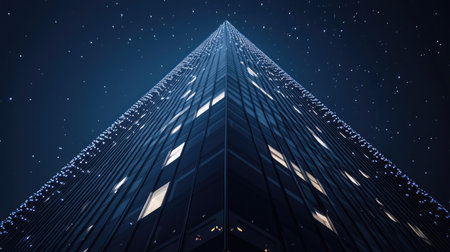 Office skyscraper towering against the night sky, with interior lights forming geometric patterns across its facade