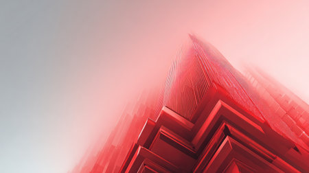This captivating abstract image features a tall building enveloped in vibrant red hues and soft fog, highlighting unique architectural details and a surreal atmosphere.