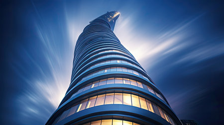 Low angle view of a skyscraper at night.