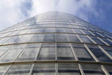 Top of round skyscraper of glass and reinforced concrete against the blue sky with clouds. Bottom view.