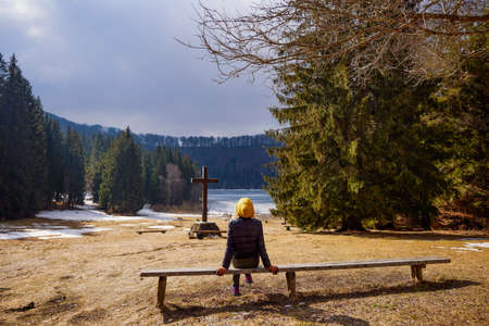 woman admiring the beautiful and volcanic lake Saint Ana in the winter time. Saint Ana volcanic lake in Tusnad Romania