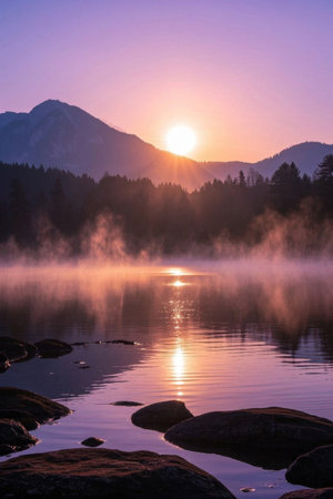 A serene lake reflects the warm hues of sunrise, with mist rising from the water and silhouetted mountains and a forest in the background.