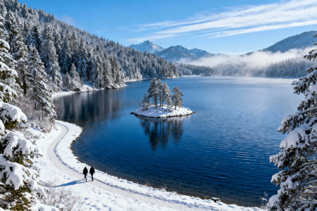 snowy mountains and trees in the alps. View of the lake Eibsee. Germany.