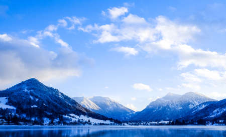 Beautiful winter landscape with alpine lake and mountains at sunset.
