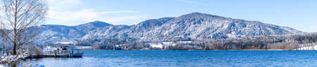 Panoramic view of Longemer Lake in the Vosges mountains, Xonrupt-Longemer, Lorraine, France. Picturesque winter landscape with white snowy trees, a bench and a house reflected in water.