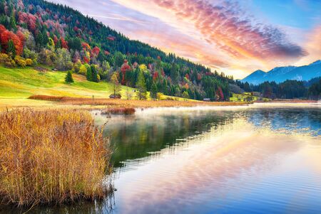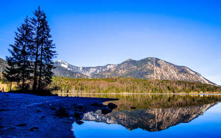 Marvelous view of Wagenbruchsee (Geroldsee) lake with Karwendelspitze mountain range on background. Location: Geroldsee, Krun, Bavarian Alps, Germany, Europe