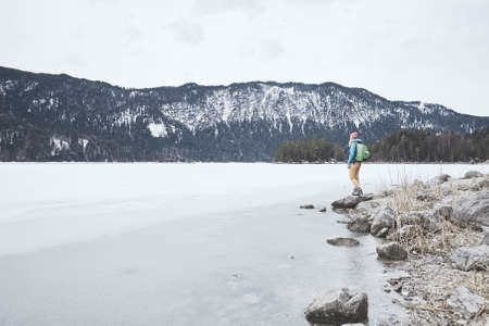 Young female hiker with backpack enjoying view to frozen lake Eibsee, winter Bavarian forest and snowy mountains at base of Zugspitze, Alps - nature lovers travel concept