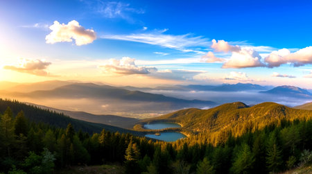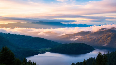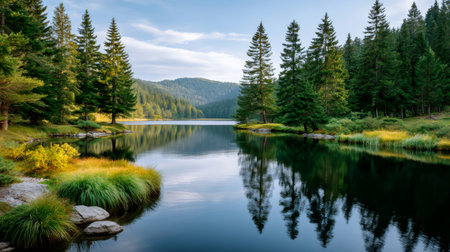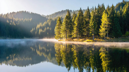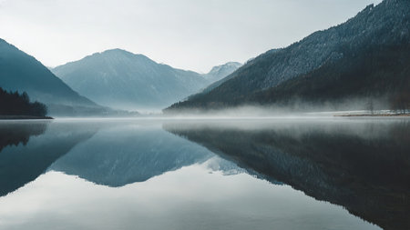 a foggy forest and lake nestled amidst hills create a minimalist background in this uhd image captured by leszek bujnowski. the mirrored effect adds to the atmospheric environment, evoking a moody and atmospheric ambiance. perfect for those who appreciate the cabincore aesthetic. ai generated