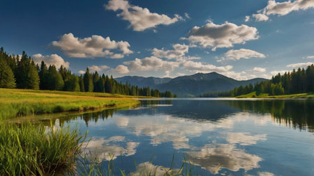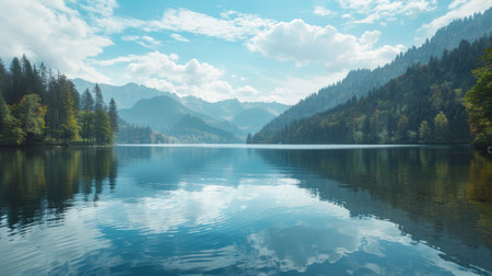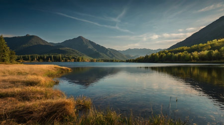 Mountain lake in the morning. Beautiful summer landscape with mountains.