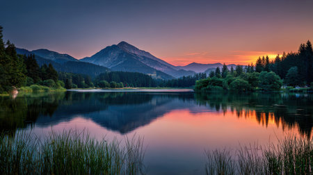Serene Mountain Reflection in Calm Lake During Sunset with Vibrant Colors and Lush Greenery Surrounding the Tranquil Water Landscape