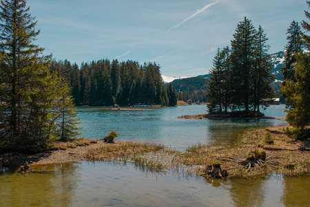 Landscape of a mountain lake in the Alps with mountains in the background