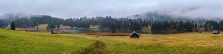 Alpine lake Geroldee or Wagenbruchsee, Bavaria, Germany. Autumn overcast, foggy and drizzle day. Picturesque traveling, seasonal, weather, and rural nature beauty concept scene.