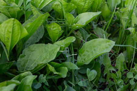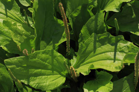 Top Close View of Leaves and Flower Stalks of Perennial Plant weed, or natural remedy Plantain, or Ripple Grass, or Rib Grass, which is herb medical uses supplement