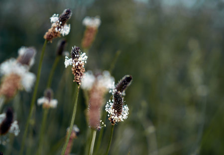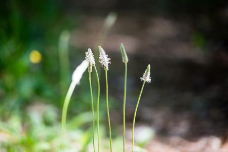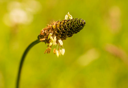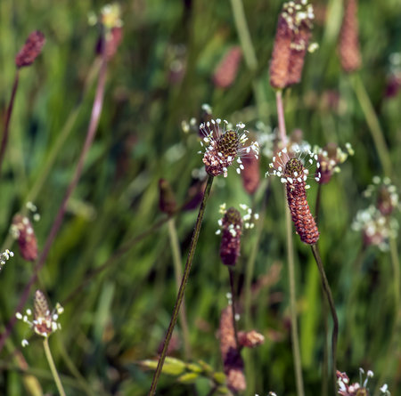 Plantago Lanceolata, Ribwort, English, Buckhorn or Narrowleaf Plantain flower macro with bokeh background, selective focus, shallow DOF