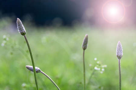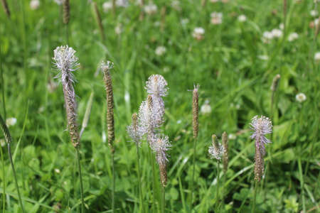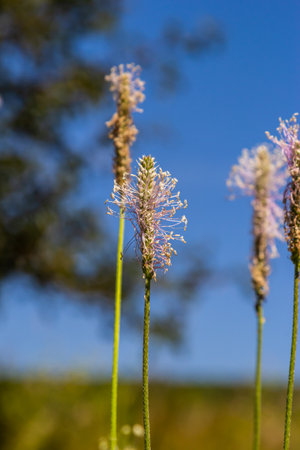 Flowers of ribwort plantain on a blurry green background on a bright sunny summer day