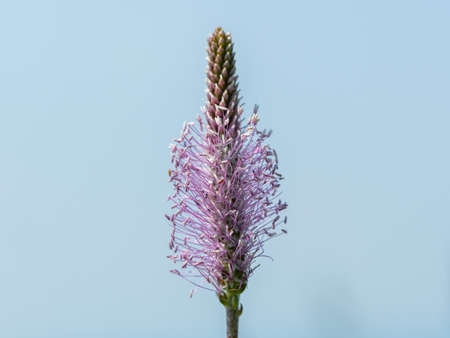 Plantago lanceolata ribwort plantain, narrowleaf plantain, English plantain, ribleaf or lamb's tongue flower closeup. This plant is considered to be an indicator of agriculture in pollen diagrams,