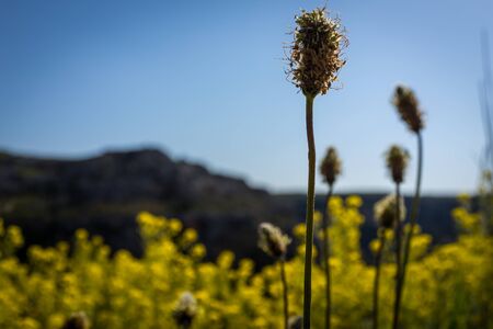 Close up of English Plantain (Plantago lanceolata) blooming on a meadow, San Francisco bay area, California