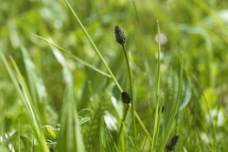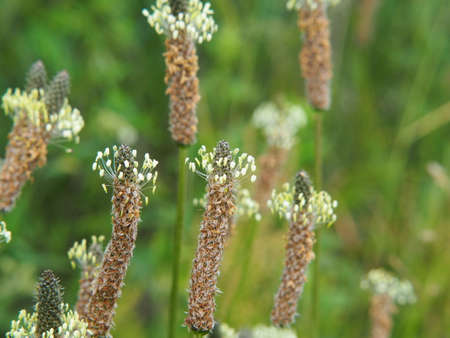 Close-up of plantain plantain (Plantago lanceolata) blooming in the field